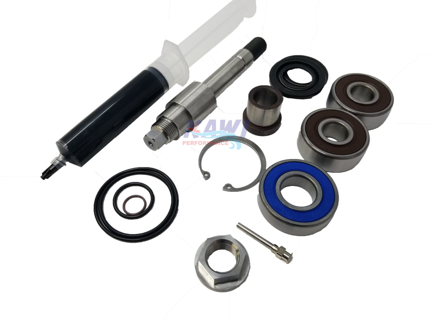 KP one step Racing Pump shaft (KP makes the strongest and highest quality shafts in the industry!), KP Bushing, 316SS Snap Ring, Premium Aftermarket seals and KP grade 8 nut (Stronger than OEM), KP rear bearing, KP Premium O-Rings and the best high performance marine grease.
