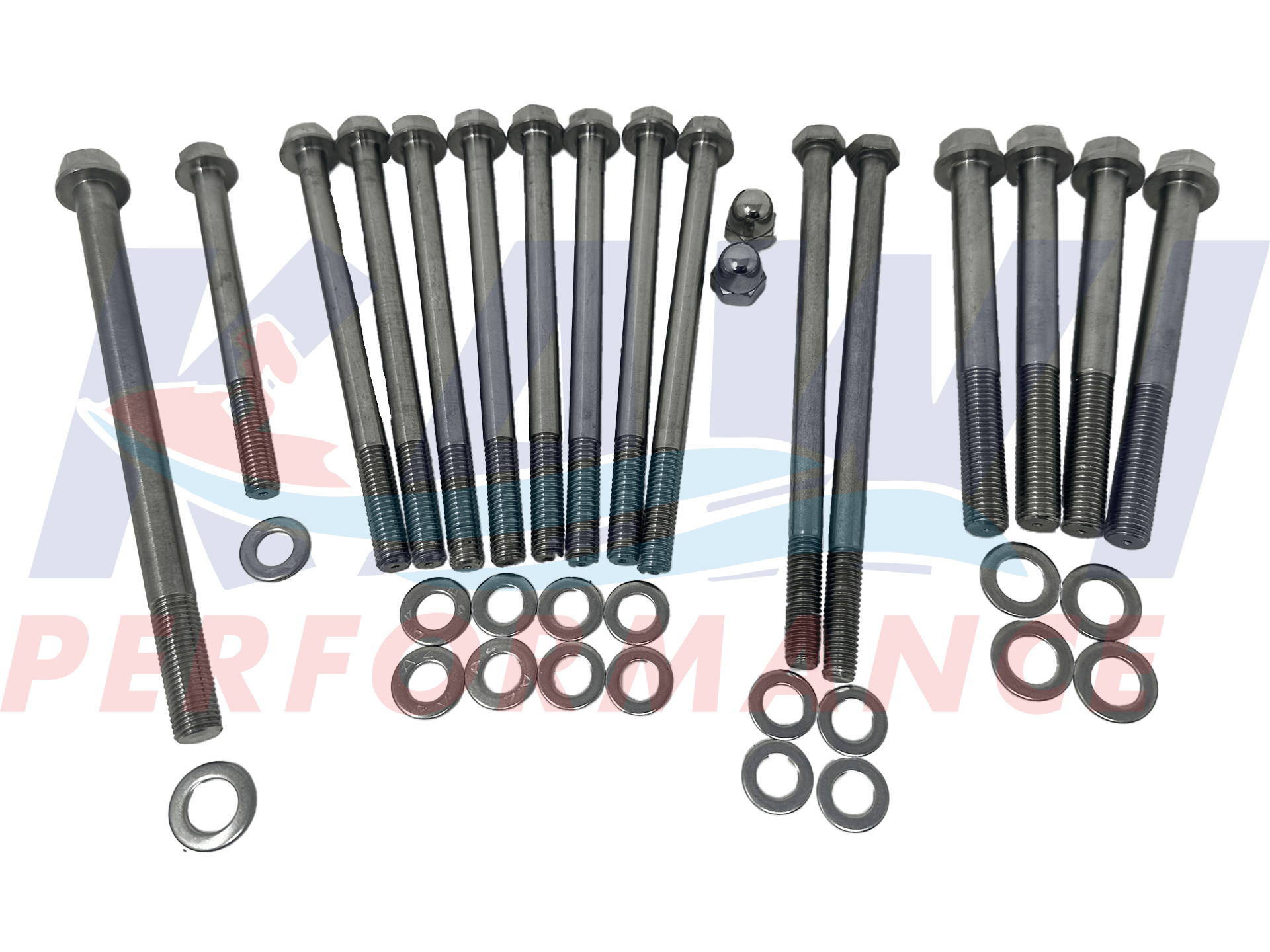 Replaces OEM steel bolts known to corrode and strip upon removal. These bolts will withstand the high salt or corrosive environments and look great! Covers exhaust manifold that bolts to cylinder head, and both exhaust manifold connections all way back to the water box.